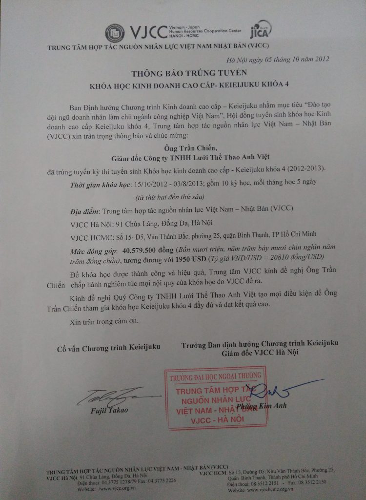 Tháng 10 năm 2012, bằng kinh nghiệm và vốn hiểu biết của mình, ông Trần Chiến đã trúng tuyển khóa “Kinh doanh cao cấp – KEIEIJUKU khóa 4” do Trung tâm hợp tác nguồn nhân lực Việt Nam – Nhật Bản (VJCC) tổ chức.